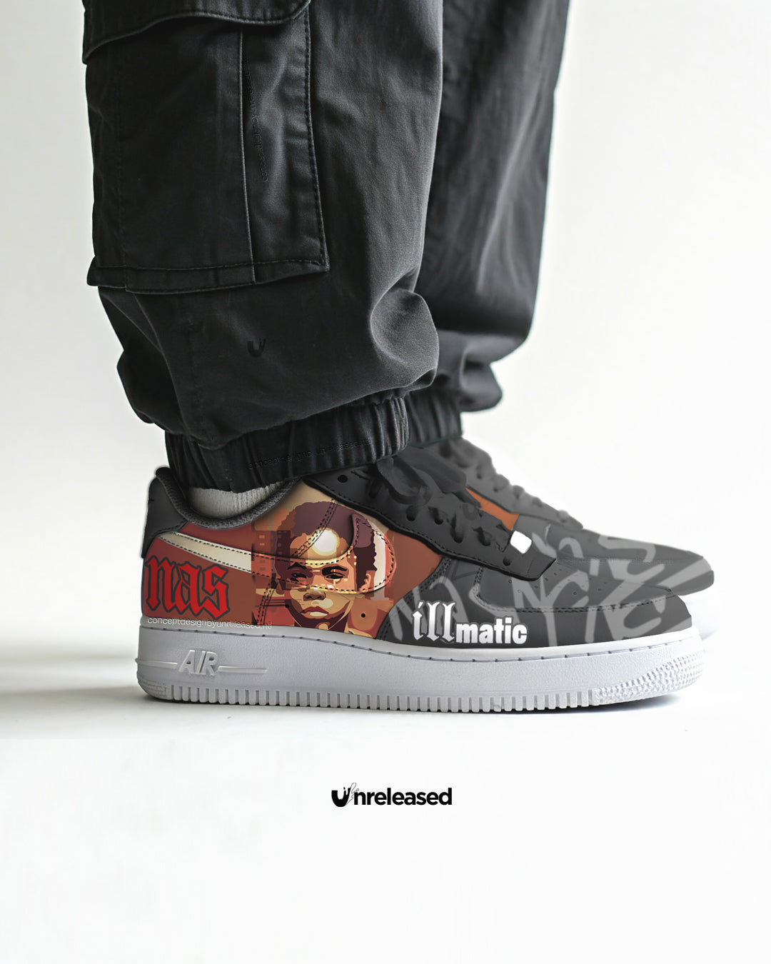 Design concept by @unreleased.ntl —no brand affiliation. A limited release of NAS' ILLMATIC Inspired AF1. Specially handpainted by @nevertoolavish.